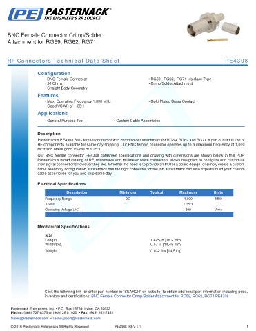 Our BNC female connector PE4308 datasheet specifications and drawing with dimensions are shown below in this PDF.