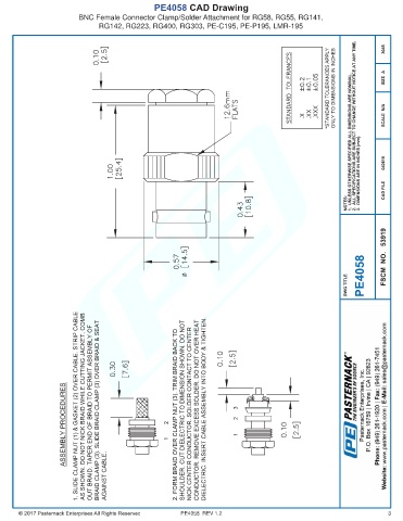 PE4058 CAD Drawing BNC Female Connector Clamp/Solder Attachment for RG58, RG55, RG141, RG142, RG223, RG400, RG303, PE-C195, PE-P195, LMR-195 PE4058 REV 1.2 3