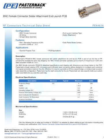 Pasternack’s PE44616 BNC female connector with solder attachment for end launch PCB is part of our full line of RF
