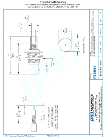 PE45064 CAD Drawing BNC Female Bulkhead Mount Isolated Ground Connector Crimp/ Crimp Attachment for RG58, PE-C195, PE-P195, LMR-195 © 2014 Pasternack Enterprises All Rights Reserved PE45064 REV 1.0 3