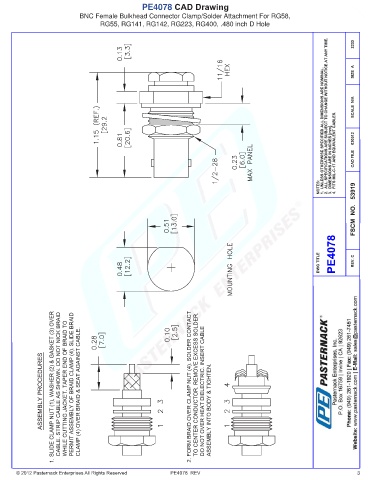 PE4078 CAD Drawing BNC Female Bulkhead Connector Clamp/Solder Attachment For RG58, RG55, RG141, RG142, RG223, RG400, .480 inch D Hole © 2012 Pasternack Enterprises All Rights Reserved PE4078 REV 3