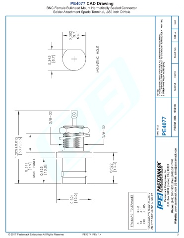 PE4077 CAD Drawing BNC Female Bulkhead Mount Hermetically Sealed Connector Solder Attachment Spade Terminal, .350 inch D Hole PE4077 REV 1.4 3