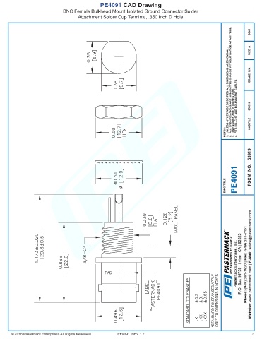 PE4091 CAD Drawing BNC Female Bulkhead Mount Isolated Ground Connector Solder Attachment Solder Cup Terminal, .350 inch D Hole PE4091 REV 1.2 3
