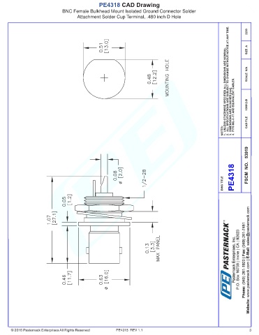 PE4318 CAD Drawing BNC Female Bulkhead Mount Isolated Ground Connector Solder Attachment Solder Cup Terminal, .480 inch D Hole PE4318 REV 1.1 3
