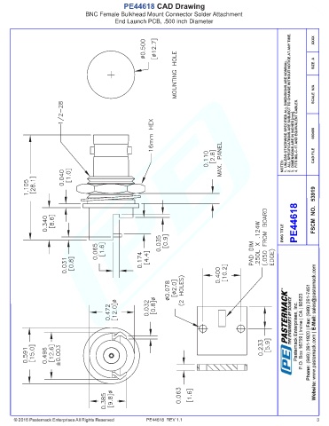 PE44618 CAD Drawing BNC Female Bulkhead Mount Connector Solder Attachment End Launch PCB, .500 inch Diameter PE44618 REV 1.1 3