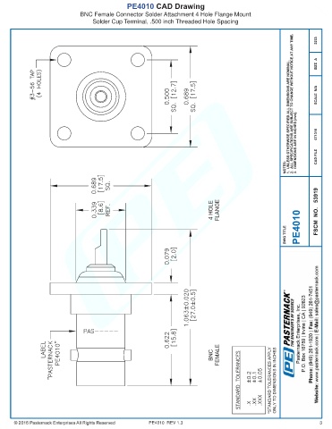 PE4010 CAD Drawing BNC Female Connector Solder Attachment 4 Hole Flange Mount Solder Cup Terminal, .500 inch Threaded Hole Spacing PE4010 REV 1.3 3