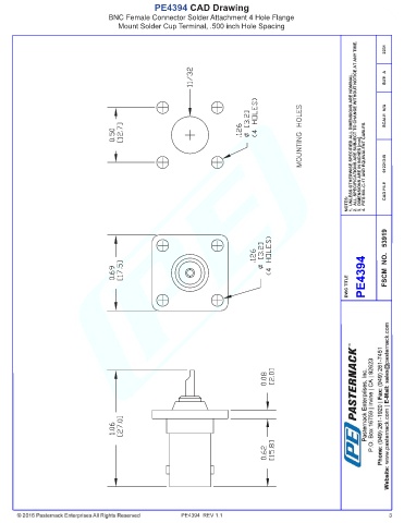 PE4394 CAD Drawing BNC Female Connector Solder Attachment 4 Hole Flange Mount Solder Cup Terminal, .500 inch Hole Spacing PE4394 REV 1.1 3
