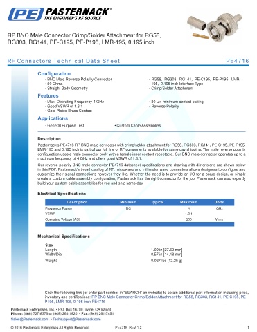 Pasternack’s PE4716 RP BNC male connector with crimp/solder attachment for RG58, RG303, RG141, PE-C195, PE-P195,