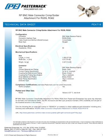 inventory and certifications: RP BNC Male Connector Crimp/Solder Attachment For RG59, RG62 PE4718