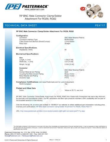 inventory and certifications: RP BNC Male Connector Clamp/Solder Attachment For RG59, RG62 PE4717