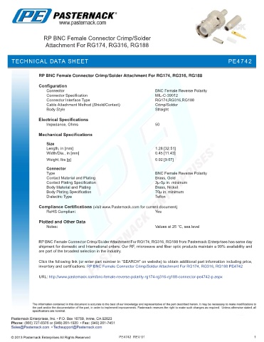 inventory and certifications: RP BNC Female Connector Crimp/Solder Attachment For RG174, RG316, RG188 PE4742