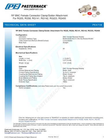 inventory and certifications: RP BNC Female Connector Clamp/Solder Attachment For RG55, RG58, RG141, RG142,