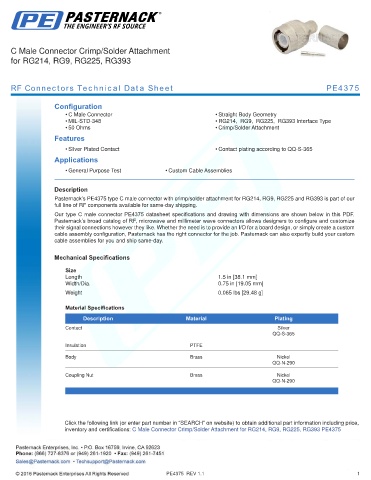 Pasternack’s PE4375 type C male connector with crimp/solder attachment for RG214, RG9, RG225 and RG393 is part of our