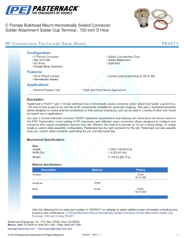 Pasternack’s PE4971 type C female bulkhead mount hermetically sealed connector solder attachment solder cup terminal,