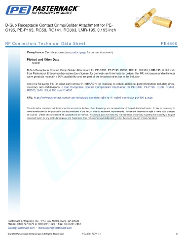 inventory and certifications: D-Sub Receptacle Contact Crimp/Solder Attachment for PE-C195, PE-P195, RG58, RG141,
