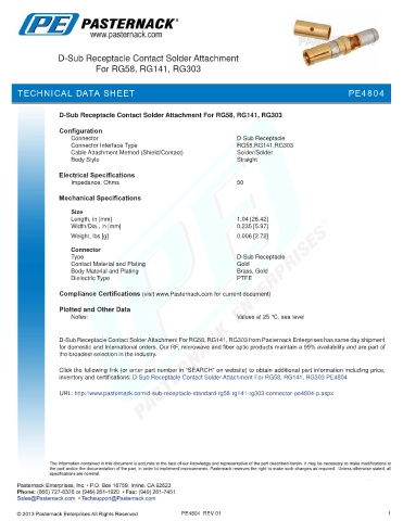 inventory and certifications: D-Sub Receptacle Contact Solder Attachment For RG58, RG141, RG303 PE4804
