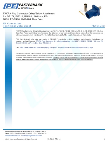 any representation or warranty regarding the suitability of the part described herein for any particular purpose, and Pasternack does not assume any liability arising out of the use of any part or documentation.
