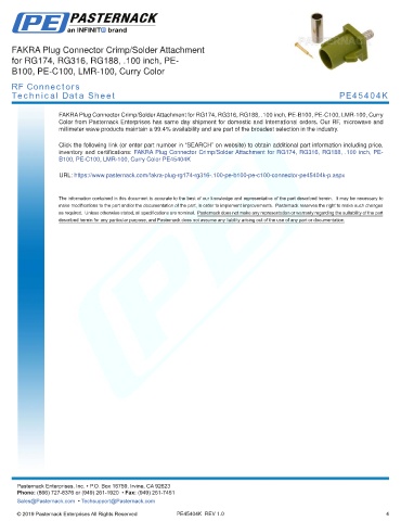 any representation or warranty regarding the suitability of the part described herein for any particular purpose, and Pasternack does not assume any liability arising out of the use of any part or documentation.