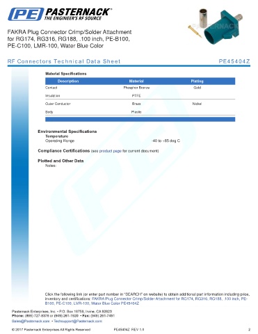inventory and certifications: FAKRA Plug Connector Crimp/Solder Attachment for RG174, RG316, RG188, .100 inch, PE-
