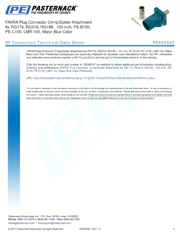 inventory and certifications: FAKRA Plug Connector Crimp/Solder Attachment for RG174, RG316, RG188, .100 inch, PE-