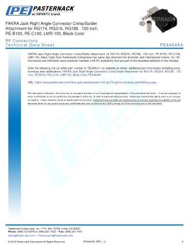 any representation or warranty regarding the suitability of the part described herein for any particular purpose, and Pasternack does not assume any liability arising out of the use of any part or documentation.