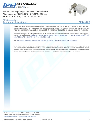 any representation or warranty regarding the suitability of the part described herein for any particular purpose, and Pasternack does not assume any liability arising out of the use of any part or documentation.