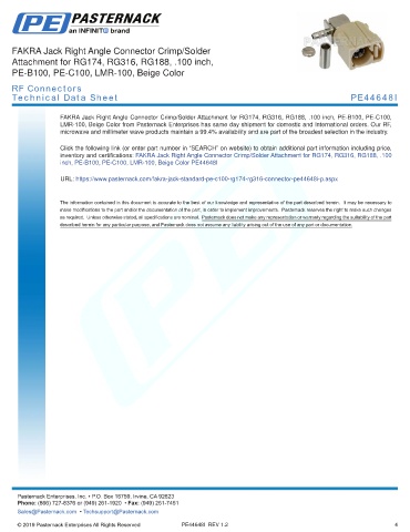 any representation or warranty regarding the suitability of the part described herein for any particular purpose, and Pasternack does not assume any liability arising out of the use of any part or documentation.