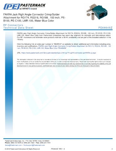 any representation or warranty regarding the suitability of the part described herein for any particular purpose, and Pasternack does not assume any liability arising out of the use of any part or documentation.