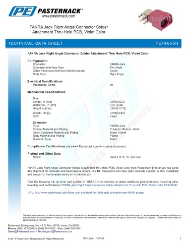 inventory and certifications: FAKRA Jack Right Angle Connector Solder Attachment Thru Hole PCB, Violet Color PE44650H