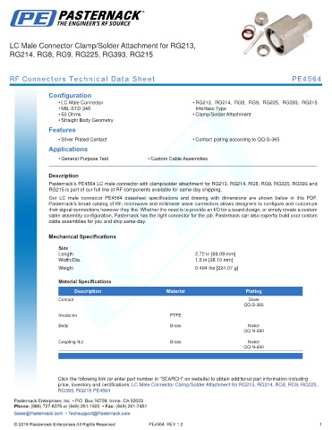 Pasternack’s PE4564 LC male connector with clamp/solder attachment for RG213, RG214, RG8, RG9, RG225, RG393 and