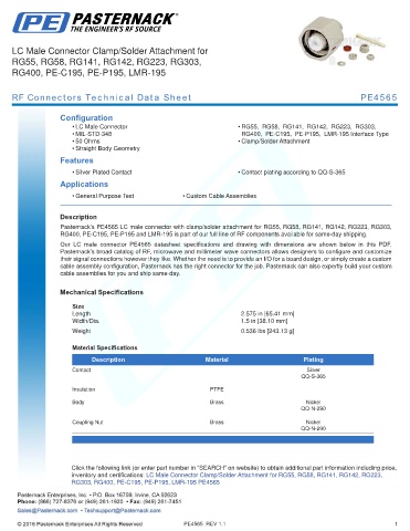Pasternack’s PE4565 LC male connector with clamp/solder attachment for RG55, RG58, RG141, RG142, RG223, RG303,