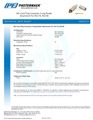 inventory and certifications: MC-Card Plug Connector Crimp/Solder Attachment For RG178, RG196 PE44310