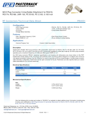 Pasternack’s PE4551 MCX plug connector with crimp/solder attachment for RG316, RG174, RG188, LMR-100, PE-B100,