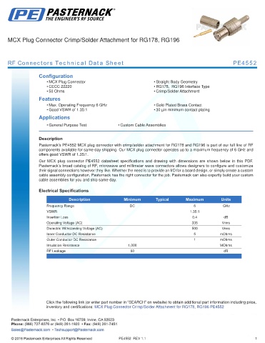 Pasternack’s PE4552 MCX plug connector with crimp/solder attachment for RG178 and RG196 is part of our full line of RF