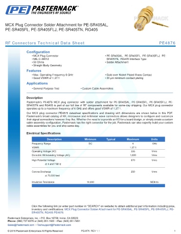 Pasternack’s PE4876 MCX plug connector with solder attachment for PE-SR405AL, PE-SR405FL, PE-SR405FLJ, PE-