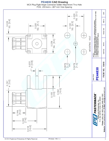 PE44830 CAD Drawing MCX Plug Right Angle Connector Solder Attachment Thru-Hole PCB, .200 inch x .067 inch Hole Spacing © 2014 Pasternack Enterprises All Rights Reserved PE44830 REV 1.1 3