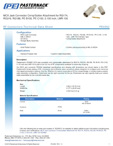 Pasternack’s PE4562 MCX jack connector with crimp/solder attachment for RG174, RG316, RG188, PE-B100, PE-C100,