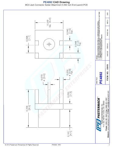 PE4892 CAD Drawing MCX Jack Connector Solder Attachment 0.062 inch End Launch PCB © 2013 Pasternack Enterprises All Rights Reserved PE4892 REV 2
