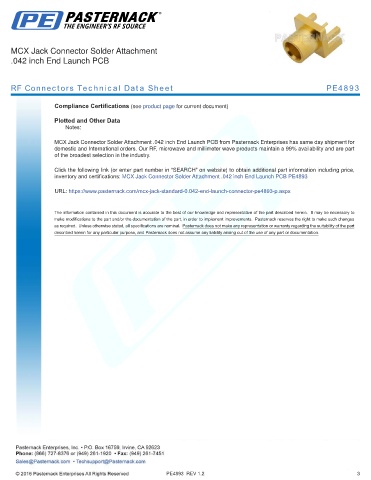 inventory and certifications: MCX Jack Connector Solder Attachment .042 inch End Launch PCB PE4893