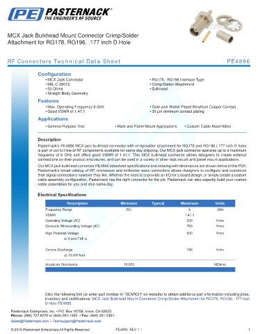 Our MCX jack bulkhead connector PE4886 datasheet specifications and drawing with dimensions are shown below in this PDF.