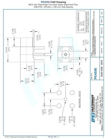 PE4556 CAD Drawing MCX Jack Right Angle Connector Solder Attachment Thru Hole PCB, .200 inch x .052 inch Hole Spacing PE4556 REV 1.3 4