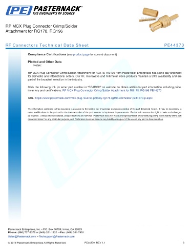 inventory and certifications: RP MCX Plug Connector Crimp/Solder Attachment for RG178, RG196 PE44370