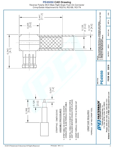 PE45050 CAD Drawing Reverse Polarity MCX Male Right Angle Push-On Connector Crimp/Solder Attachment for RG316, RG188, RG174 PE45050 REV 1.0 3