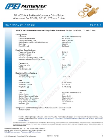 inventory and certifications: RP MCX Jack Bulkhead Connector Crimp/Solder Attachment For RG178, RG196, .177 inch D