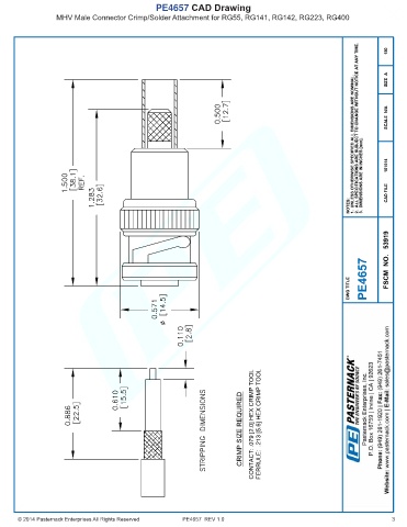 PE4657 CAD Drawing MHV Male Connector Crimp/Solder Attachment for RG55, RG141, RG142, RG223, RG400 © 2014 Pasternack Enterprises All Rights Reserved PE4657 REV 1.0 3