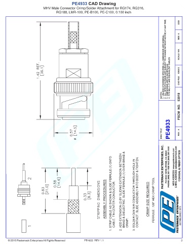 PE4933 CAD Drawing MHV Male Connector Crimp/Solder Attachment for RG174, RG316, RG188, LMR-100, PE-B100, PE-C100, 0.100 inch PE4933 REV 1.1 3