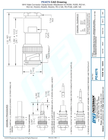PE4076 CAD Drawing MHV Male Connector Clamp/Solder Attachment for RG58, RG55, RG141, RG142, RG223, RG400, RG303, PE-C195, PE-P195, LMR-195 PE4076 REV 1.1 3