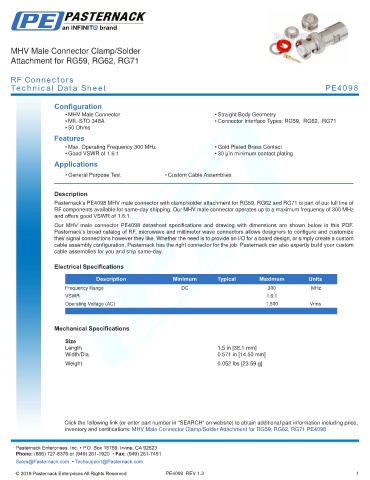 any representation or warranty regarding the suitability of the part described herein for any particular purpose, and Pasternack does not assume any liability arising out of the use of any part or documentation.