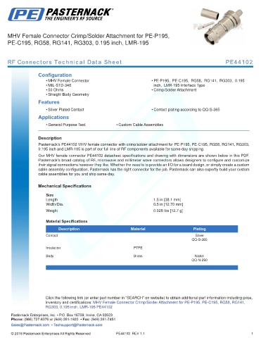 Pasternack’s PE44102 MHV female connector with crimp/solder attachment for PE-P195, PE-C195, RG58, RG141, RG303,