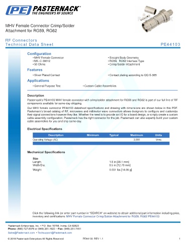 Pasternack’s PE44103 MHV female connector with crimp/solder attachment for RG59 and RG62 is part of our full line of RF